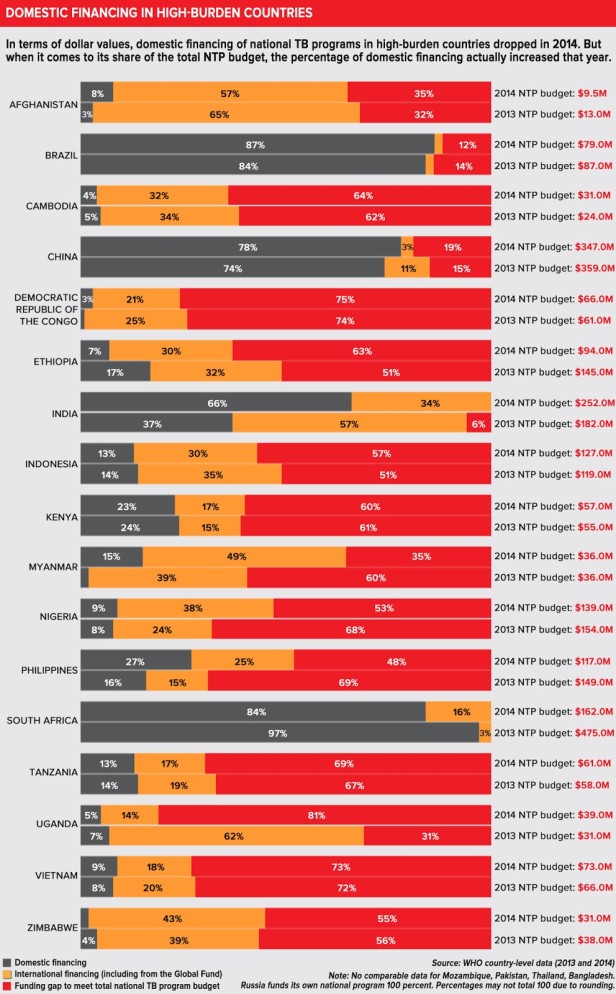 In 2014, based on WHO estimates, almost 90 percent of total global TB financing came from domestic resources.